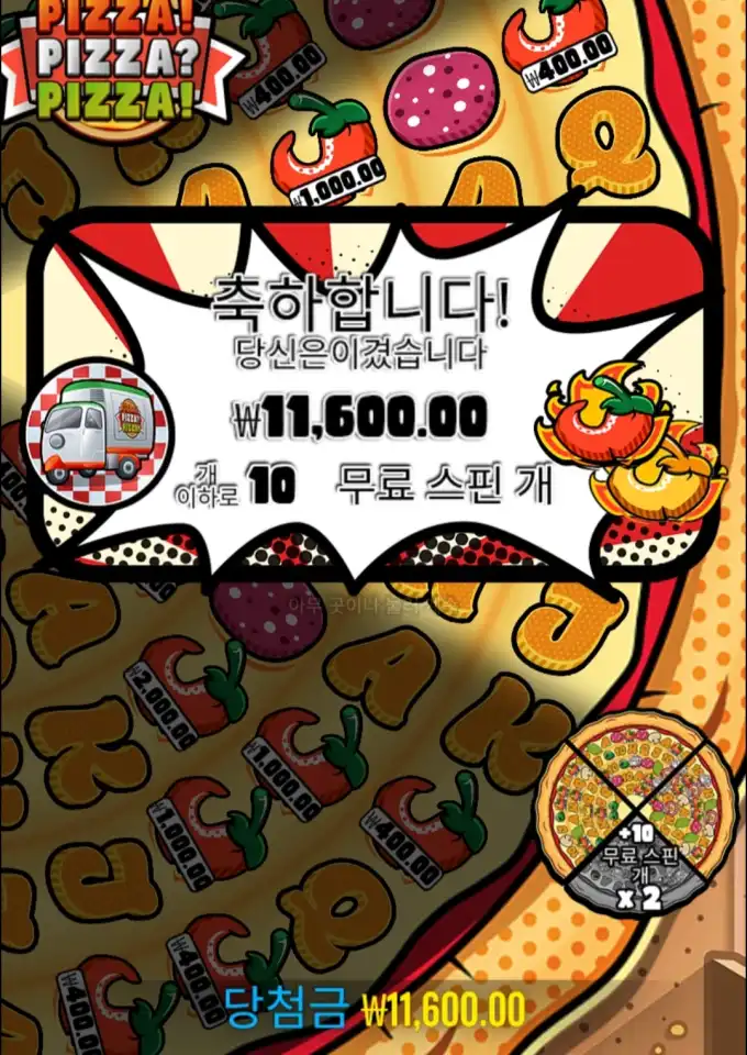 피자피자 플레이 장면 중 핵심 당첨 구간을 보여주는 이미지로, 당첨금 11600.00 / 배당 2 정보가 같이 보입니다. 10 free spins won with a payout of ₩11,600.00