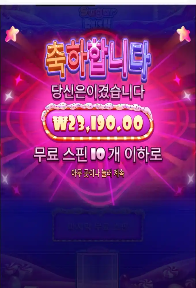 슈가러시 플레이 장면 중 핵심 당첨 구간을 보여주는 이미지로, 당첨금 23190 정보가 같이 보입니다. 요샌 본전만되도 .. 요샌 본전만되도 ..