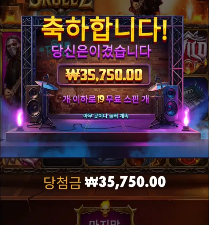 슬롯 플레이 장면 중 핵심 당첨 구간을 보여주는 이미지로, 당첨금 35750.00 정보가 같이 보입니다. 오늘은 하루종일 할꺼 같네.. - 슬롯게임 리뷰