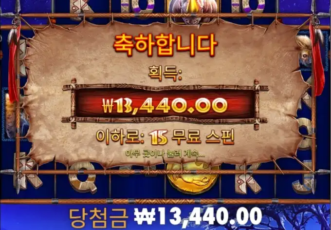그레이트 라이노 플레이 장면 중 핵심 당첨 구간을 보여주는 이미지로, 당첨금 13440.00 정보가 같이 보입니다. 15 무료 스핀