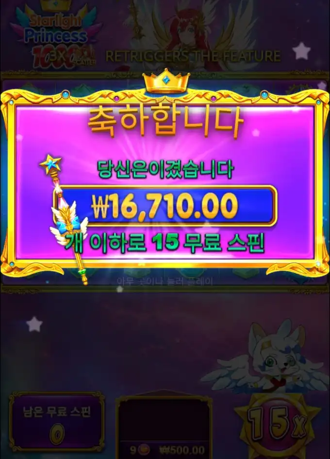 이런 건 말 길게 붙이는 것보다 장면 하나가 더 빠르긴 하죠. Starlight Princess 쪽은 ₩500.00 들어가서 ₩16,710.00 나온 장면으로 읽히고, 배당도 15x 쪽으로 보이네요.