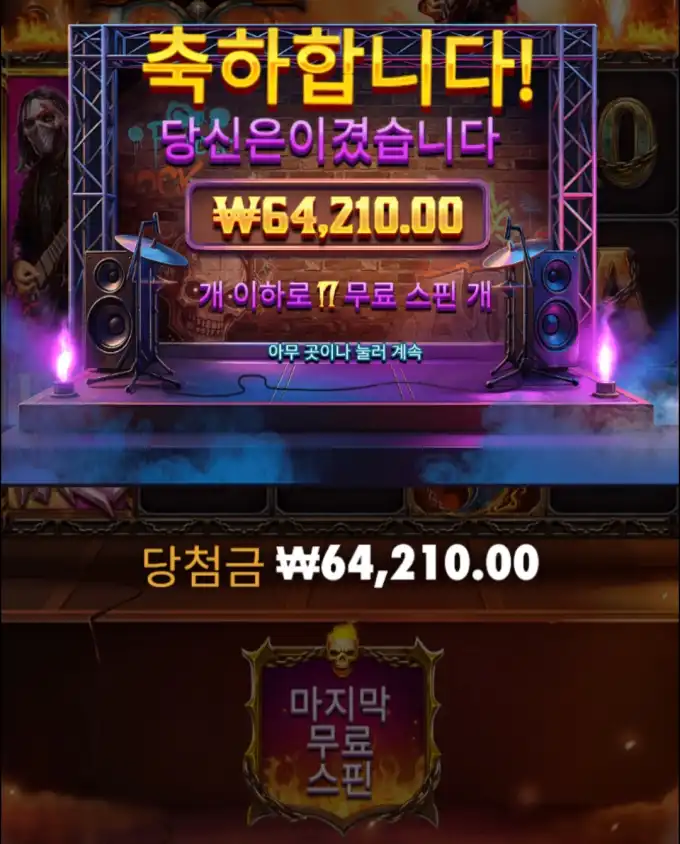 슬롯 플레이 장면 중 핵심 당첨 구간을 보여주는 이미지로, 당첨금 64210.00 정보가 같이 보입니다. 먹었으면 튀라~ - 슬롯게임 리뷰