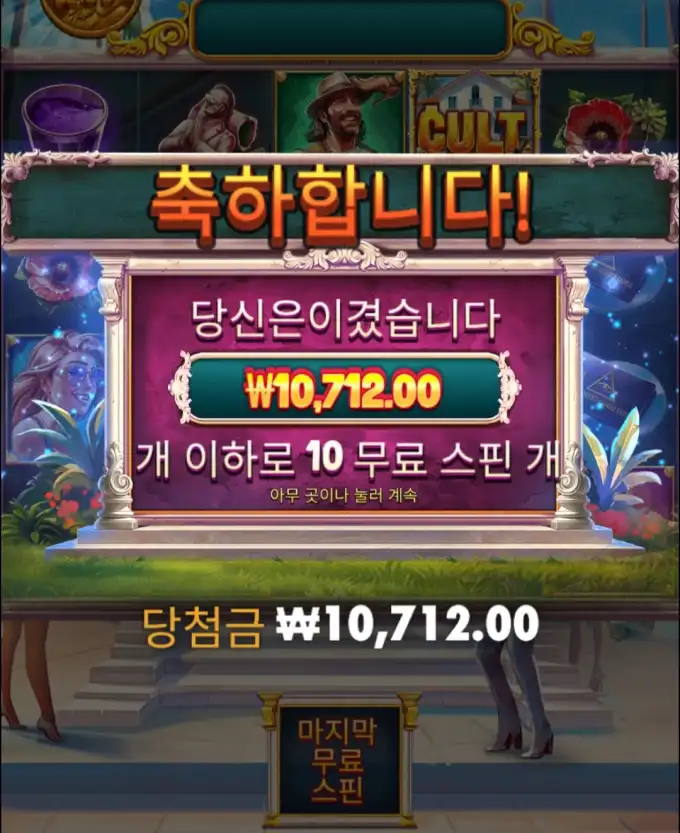 CULT 플레이 장면 중 핵심 당첨 구간을 보여주는 이미지로, 당첨금 10712.00 정보가 같이 보입니다. 축하합니다! 당신은 이겼습니다. 당첨금 ₩10,712.00