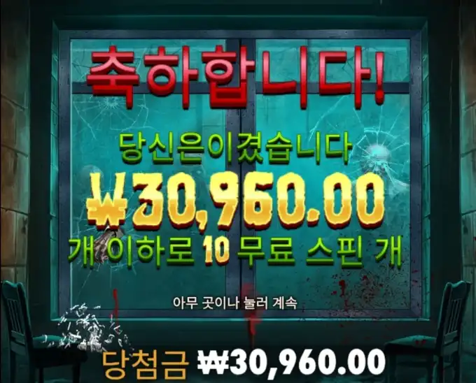좀비 플레이 장면 중 핵심 당첨 구간을 보여주는 이미지로, 당첨금 30960.00 정보가 같이 보입니다. 당신은 이겼습니다. 당첨금 ₩30,960.00