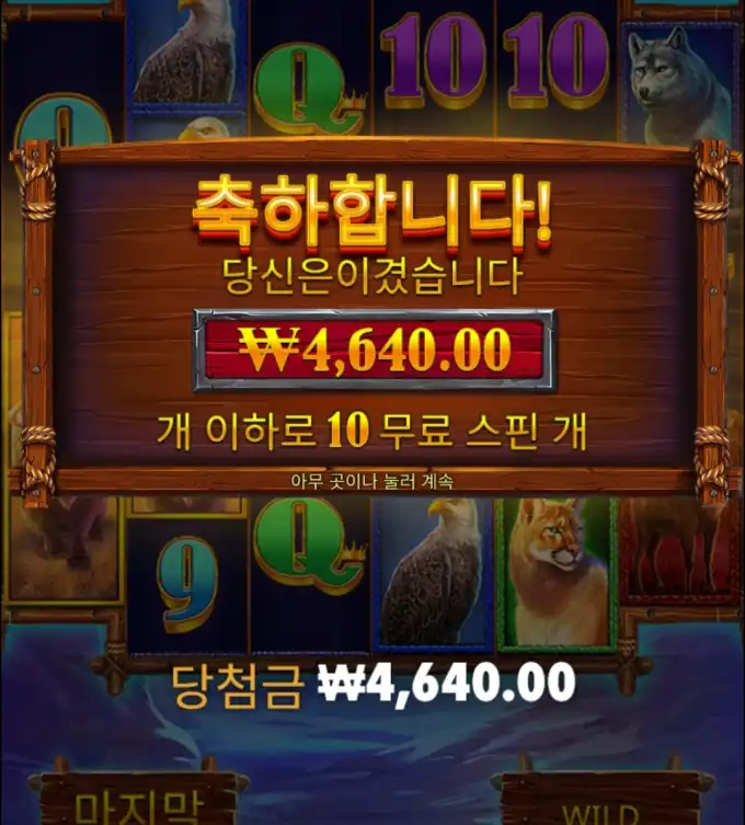 슬롯 플레이 장면 중 핵심 당첨 구간을 보여주는 이미지로, 당첨금 ₩4,640.00 정보가 같이 보입니다. Congratulations! You won ₩4,640.00 with 10 free spins.