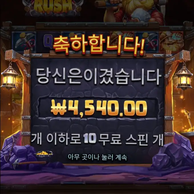 슬롯 플레이 장면 중 핵심 당첨 구간을 보여주는 이미지로, 당첨금 4540.00 정보가 같이 보입니다. 축하합니다! 당신은 이겼습니다. ₩4,540.00