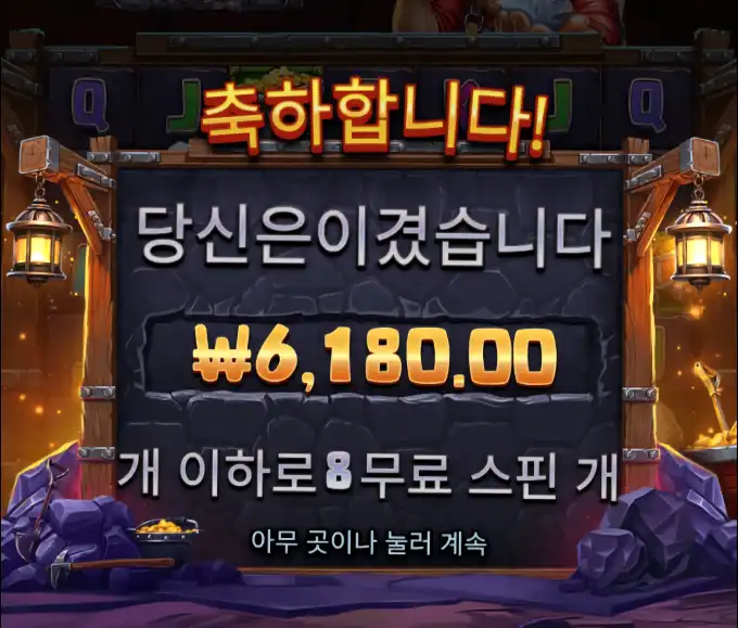 찾았다 마이닝 러쉬 플레이 장면 중 핵심 당첨 구간을 보여주는 이미지로, 당첨금 ₩6,180.00 정보가 같이 보입니다. 다이아 나왔는데 다이아 한번을 안주네..