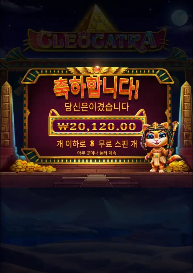 클레오캐트라 플레이 장면 중 핵심 당첨 구간을 보여주는 이미지로, 당첨금 20120 정보가 같이 보입니다. 축하합니다! 당신은 이겼습니다. ₩20,120.00 개 이하로 8 무료 스핀 개
