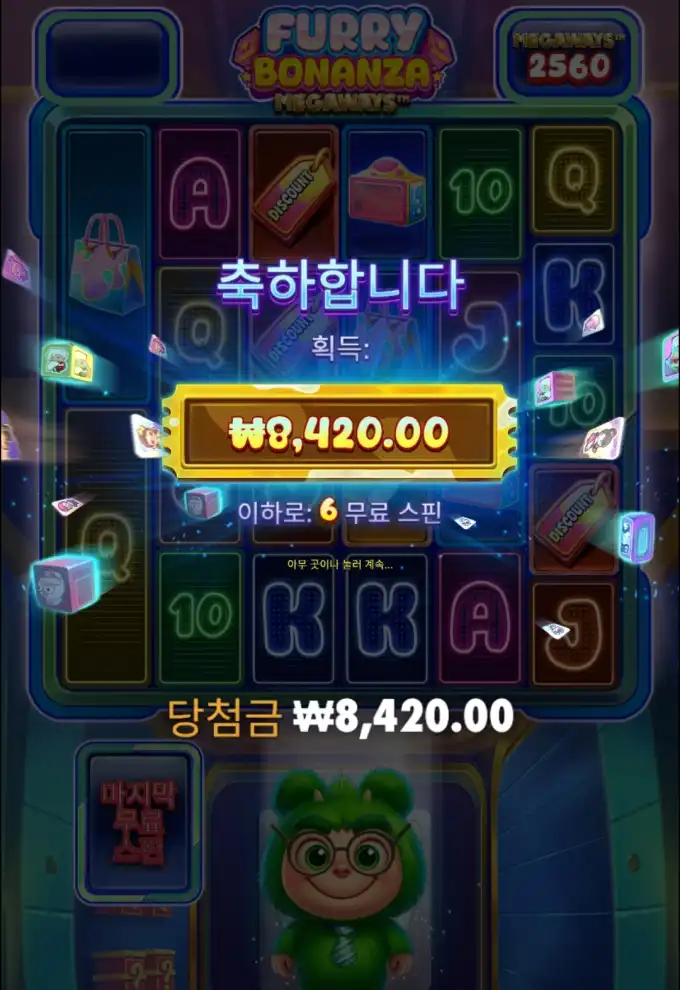 처음엔 대수롭지 않게 봤는데 숫자 뜨는 순간 눈이 가긴 했음. Furry Bonanza Megaways 쪽은 소액 들어가서 ₩8,420.00 나온 장면으로 읽히고, 배당도 배당 꽤 나온 편 쪽으로 보이네요.