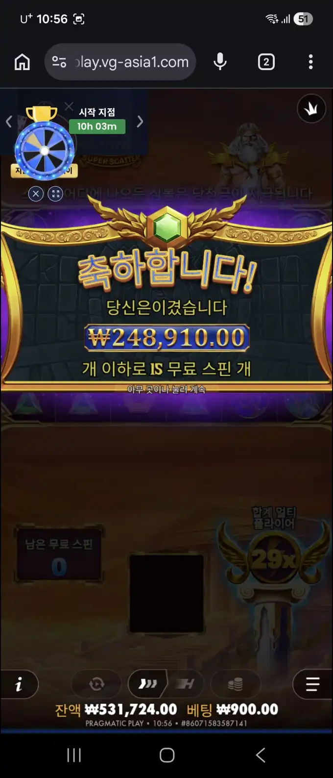 올푸슈퍼 플레이 장면 중 핵심 당첨 구간을 보여주는 이미지로, 베팅금 ₩900.00 / 당첨금 ₩248,910.00 / 배당 29x 정보가 같이 보입니다.