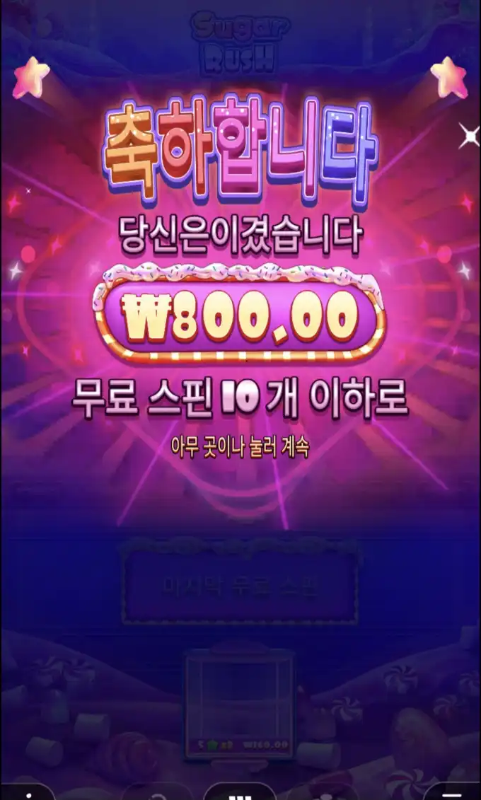 Sugar Rush 플레이 장면 중 핵심 당첨 구간을 보여주는 이미지로, 당첨금 ₩800.00 정보가 같이 보입니다. Congratulations, you won ₩800.00 with 10 or fewer free spins.