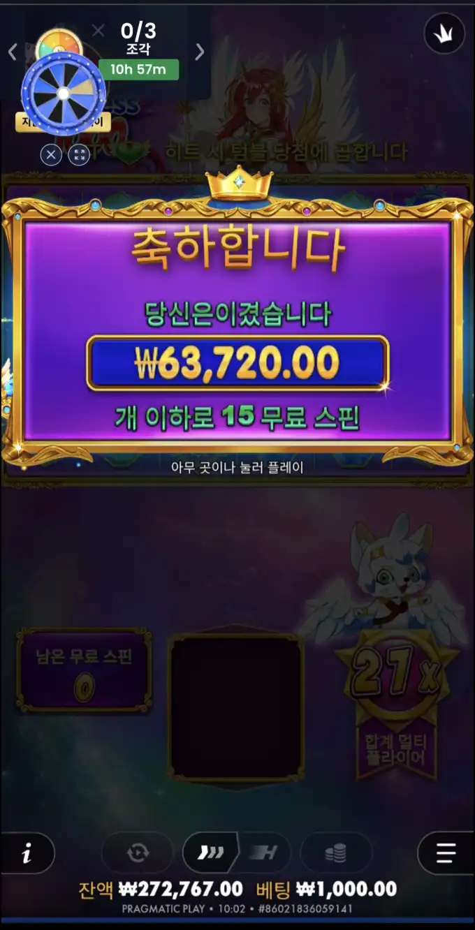 이런 건 말 길게 붙이는 것보다 장면 하나가 더 빠르긴 하죠. 슬롯 쪽은 ₩1,000.00 들어가서 ₩63,720.00 나온 장면으로 읽히고, 배당도 27x 쪽으로 보이네요.