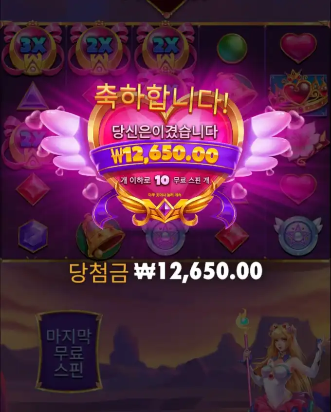 슬롯 플레이 장면 중 핵심 당첨 구간을 보여주는 이미지로, 당첨금 ₩12,650.00 정보가 같이 보입니다. Congratulations message with a payout of ₩12,650.00 and 10 free spins.