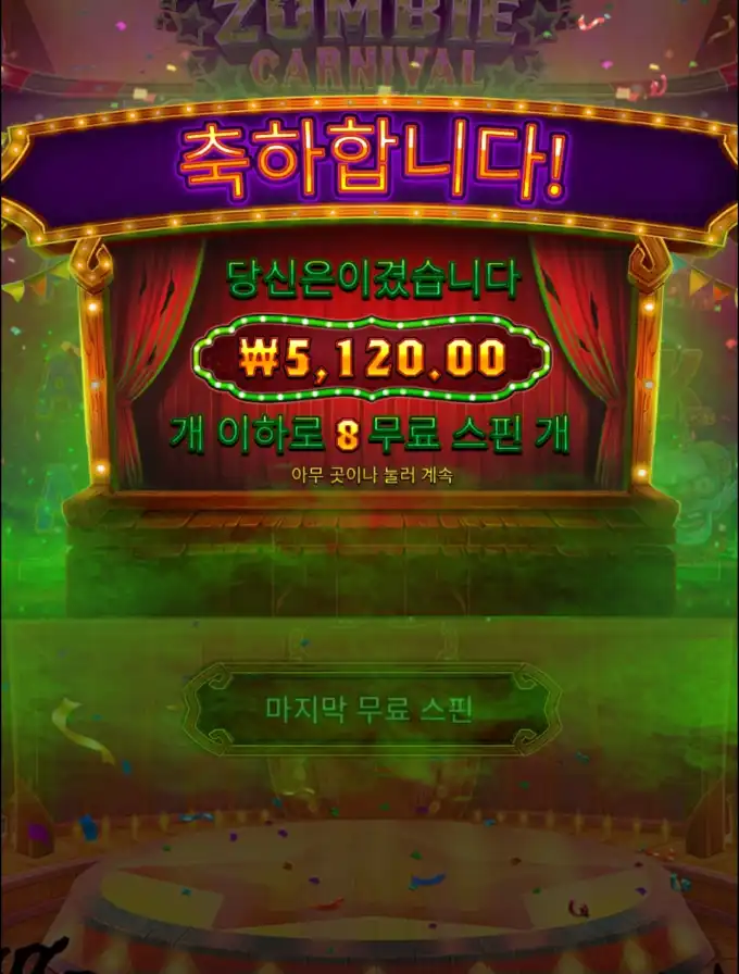 Zombie Carnival 플레이 장면 중 핵심 당첨 구간을 보여주는 이미지로, 당첨금 ₩5,120.00 정보가 같이 보입니다. 8 free spins resulted in a payout of ₩5,120.00.